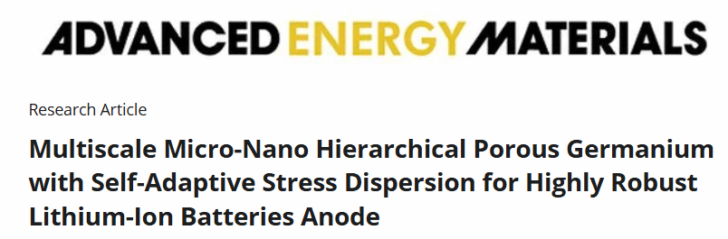 该团队的研究论文以“Multiscale Micro-Nano Hierarchical Porous Germanium with Self-Adaptive Stress Dispersion for Highly Robust Lithium-lon Batteries Anode”(具有自适应应力分散特性的多尺度微纳分级多孔锗材料用于高稳定性锂离子电池负极)为题,发表于材料领域国际顶尖期刊《Advanced Energy Materials》。据最新数据显示,该期刊 2024-2025 年度影响因子达 26.0,位列中科院材料科学领域 1 区 TOP 期刊,学术影响力与行业认可度极高。