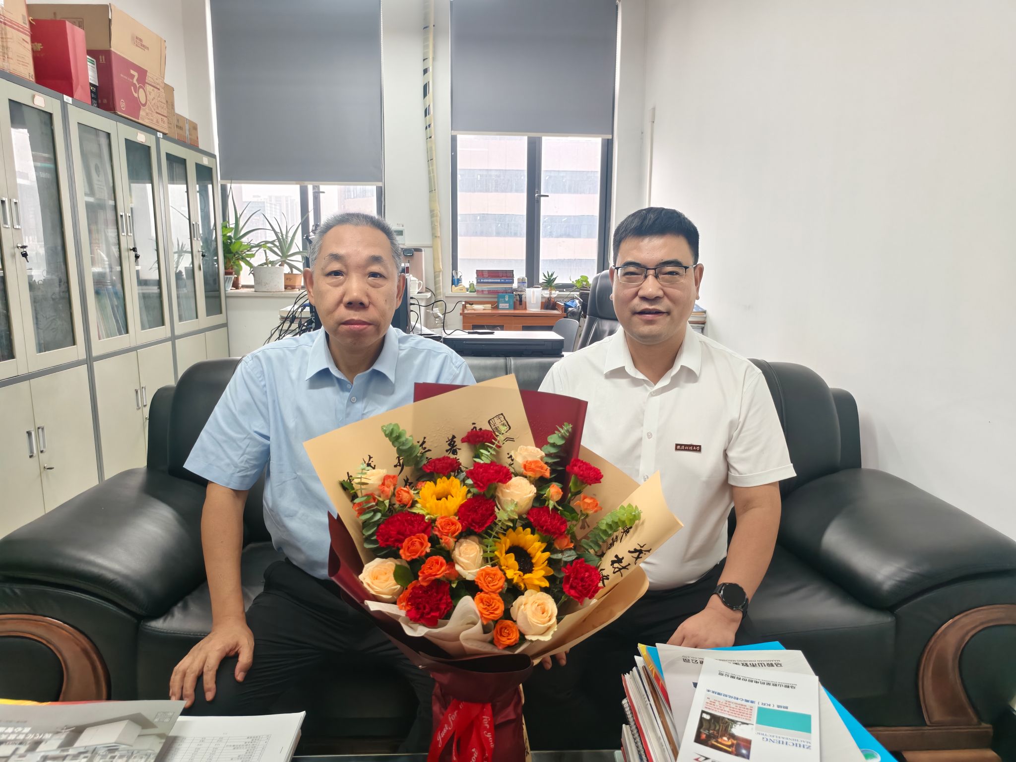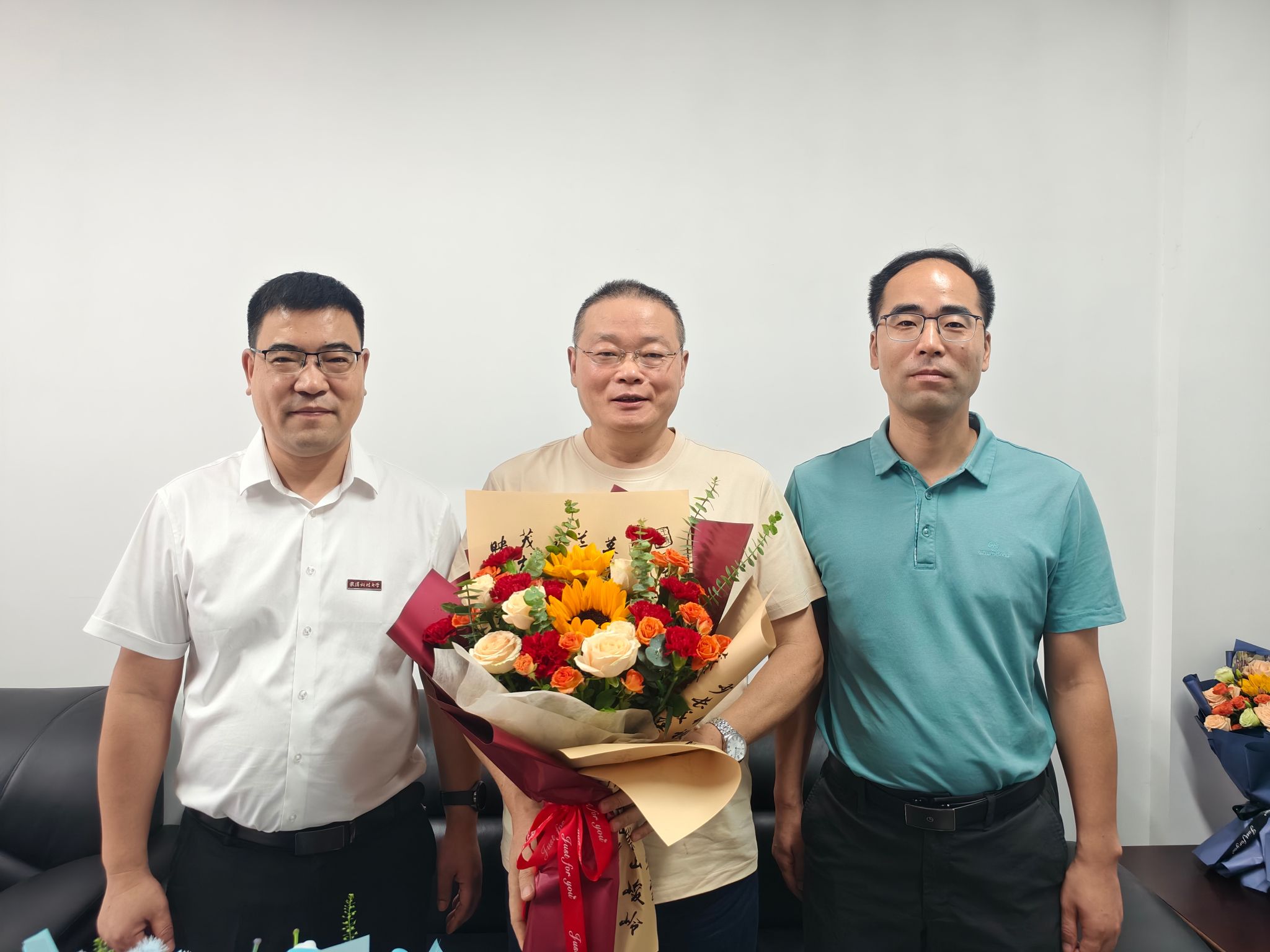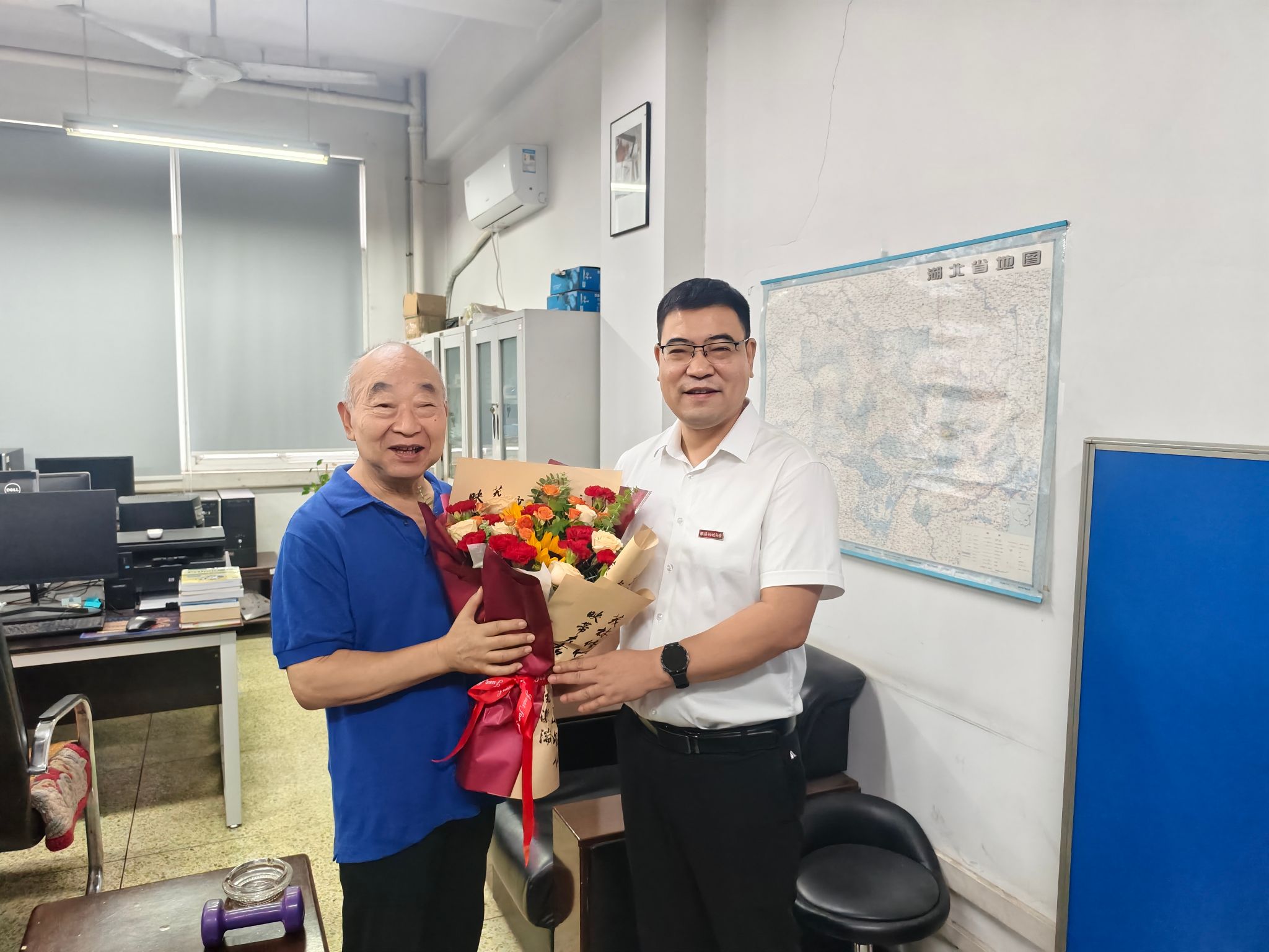 上午9时许,慰问组一行首先来到退休老教授毕学工办公室。毕学工教授是公司冶金工程学科的奠基人之一,曾主持多项国家级科研项目,为公司团队建设打下坚实基础。张华经理为毕学工教授送上鲜花并动情地说:“毕老师,教师节快乐!您是公司的‘功勋元老’,八十岁高龄还坚持每天做科研,您这份钻研精神激励着全院的年轻教师。”毕教授虽已年逾八旬,但精神矍铄,他笑着回忆起早年带领员工下厂实践的场景:“看到现在实验室设备这么先进,青年教师和员工都这么有干劲,我打心眼里高兴!”