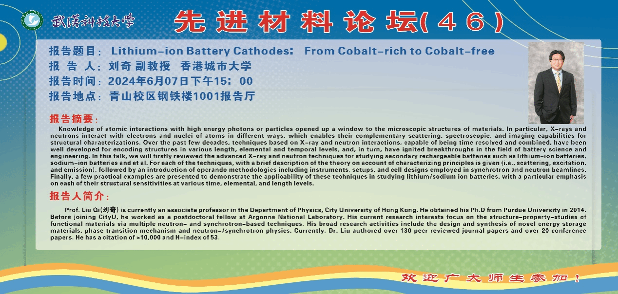 报告人简介:Prof. Liu Qi(刘奇) is currently an associate professor in the Department of Physics, City University of Hong Kong. He obtained his Ph.D from Purdue University in 2014. Before joining CityU, he worked as a postdoctoral fellow at Argonne National Laboratory. His current research interests focus on the structure-property-studies of functional materials via multiple neutron- and synchrotron-based techniques. His broad research activities include the design and synthesis of novel energy storage materials, phase transition mechanism and neutron-/synchrotron physics. Currently, Dr. Liu authored over 130 peer reviewed journal papers and over 20 conference papers. He has a citation of >10,000 and H-index of 53.