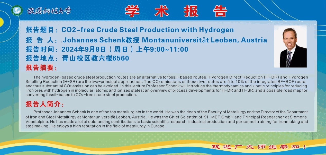 报告人简介:Professor Johannes Schenk is one of the top metallurgists in the world. He was the dean of the Faculty of Metallurgy and the Director of the Department of Iron and Steel Metallurgy at Montanuniversität Leoben, Austria. He was the Chief Scientist of K1-MET GmbH and Principal Researcher at Siemens Voestalpine. He has made a lot of outstanding contributions to basic scientific research, industrial production and personnel training for ironmaking and steelmaking. He enjoys a high reputation in the field of metallurgy in Europe.