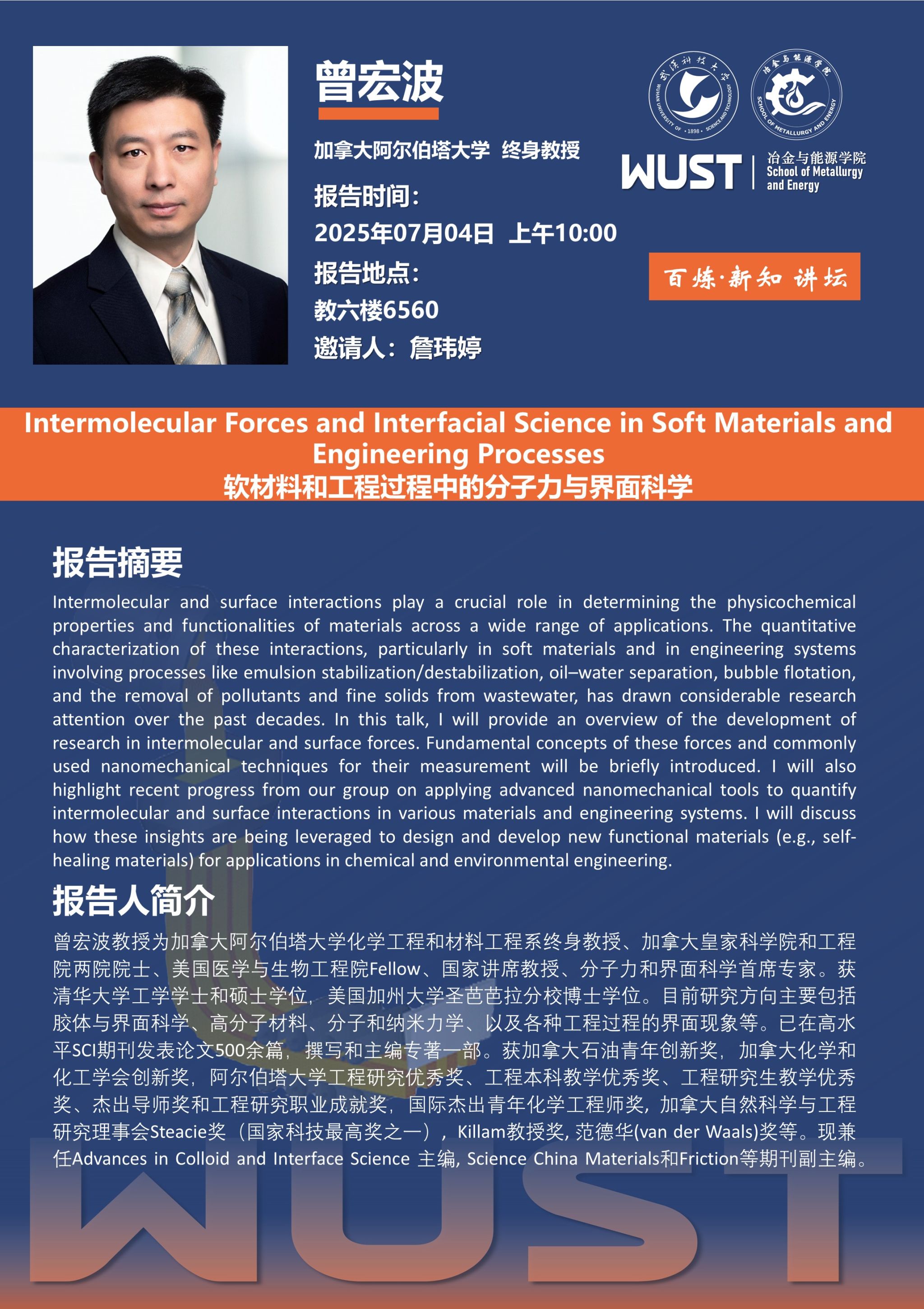 报告人简介:曾宏波教授,加拿大阿尔伯塔大学化学工程和材料工程系终身教授、加拿大皇家科公司和工程院两院