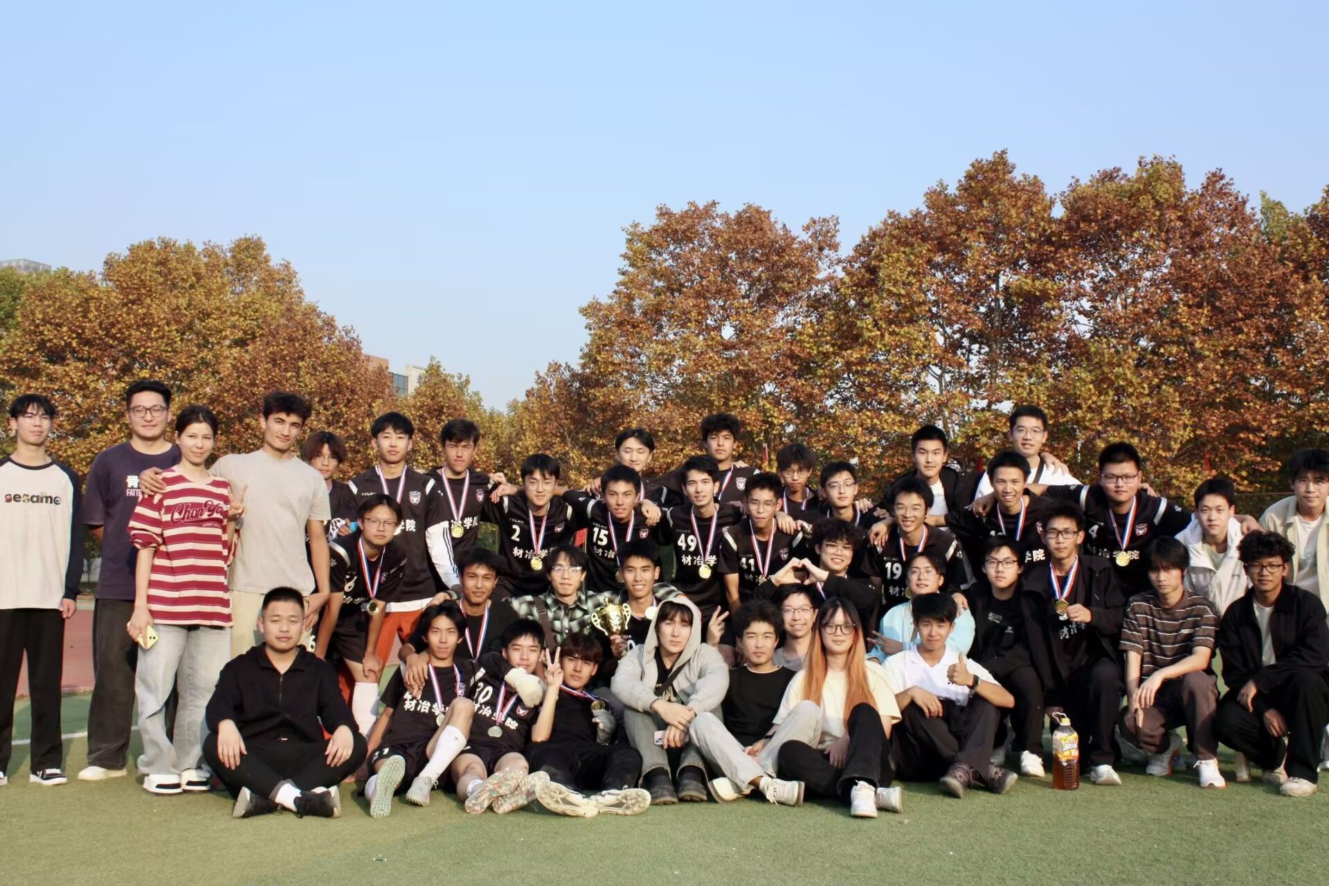 球队有一年级到三年级的三届队长共同参与球队管理。大二队长、冶金工程2401班何亦恒擅长战术分析,常指导大一球员研判对手弱点、布置防守阵型;大二队长、金材2406班库尔班·赛买提则聚焦技术提升,每天陪新队员加练射门、传球等基础动作;吕祉陶则侧重团队协作打磨,常组织分组对抗,陪队员反复练习传切配合,在实战中提升团队默契。“队长们把经验毫无保留地教给我们,这是我们能夺冠的重要原因。”吕祉陶说。