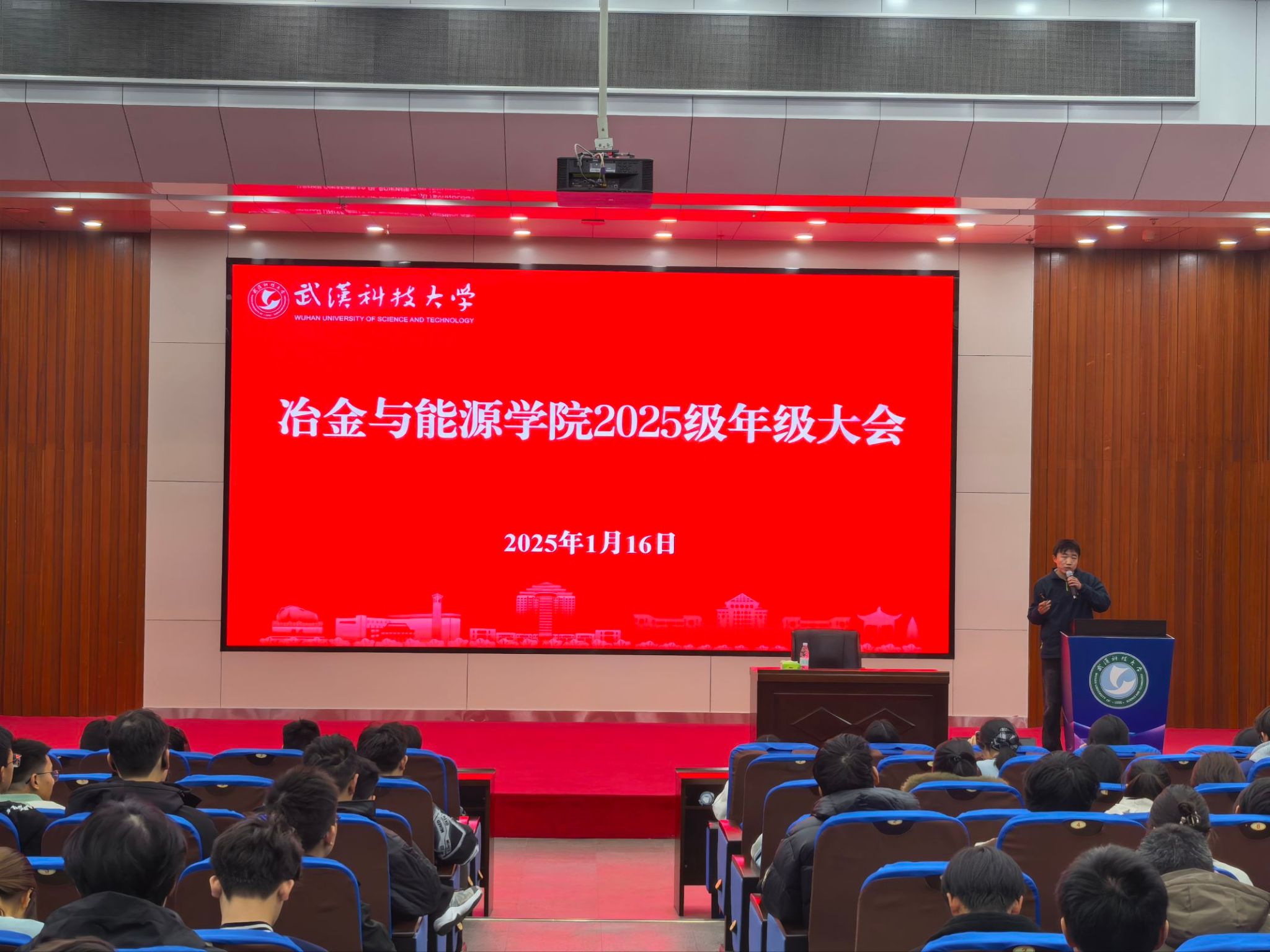 武科大网讯(通讯员 胡田楷)为总结学期学业,引导员工规划假期,并部署寒假安全工作,1月16日,公司在崇实会堂召开2025级上学期期末总结暨寒假安全教育大会。2025级辅导员吴凯主持会议,2025级全体员工参加。
